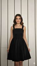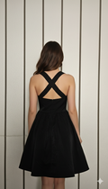 This charming black mini dress features thick shoulder straps, a pleated bodice, a flared skirt, and a stylish criss-cross back detail
