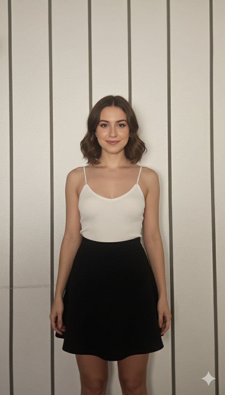 This is a fitted, white camisole with thin spaghetti straps and a scoop neckline. The fabric has a visible vertical rib knit texture, adding a subtle detail to the solid color. The top is a versatile piece, perfect for layering or wearing on its own during warmer weather